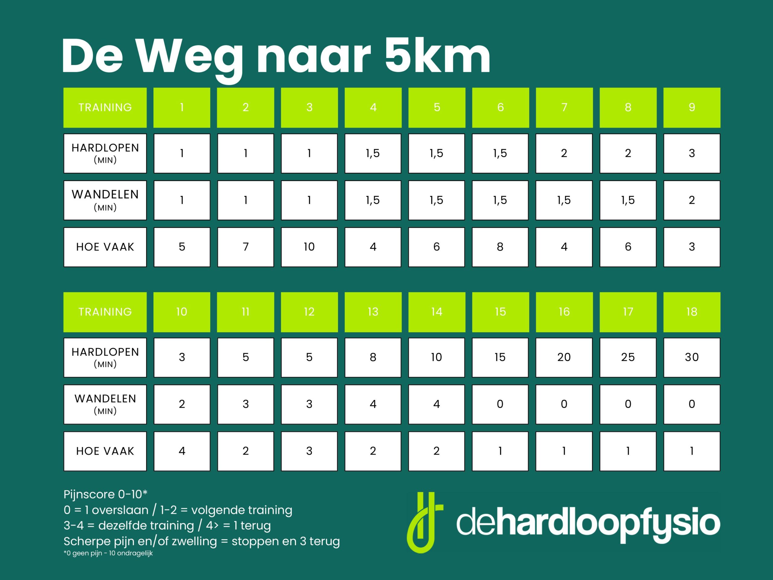 • Bouw je op vanuit een blessure? Gebruik dan de pijnscore onderaan het schema om de volgende training te bepalen. Houd ook rekening met de pijn 24u na de training